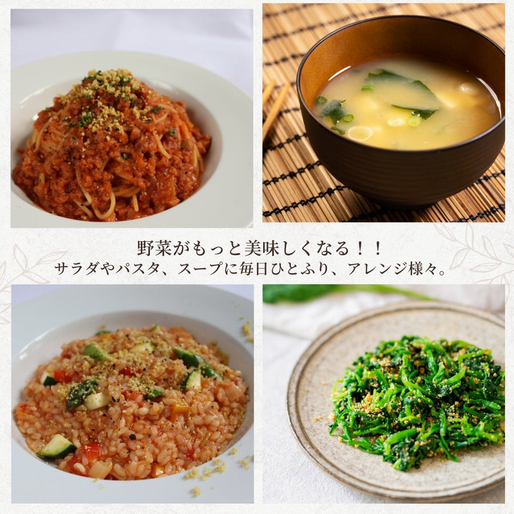 サラダやパスタ、炒め物に振りかけてみたり、リゾットやグラタン、ポテトサラダ、スープにちょい足ししてみたり、揚げ物の揚げ衣に混ぜ込んでみたり、いつもの料理にプラスαで使うことで、美味しさも栄養もちょい足ししてみるのもいいかもしれません。」