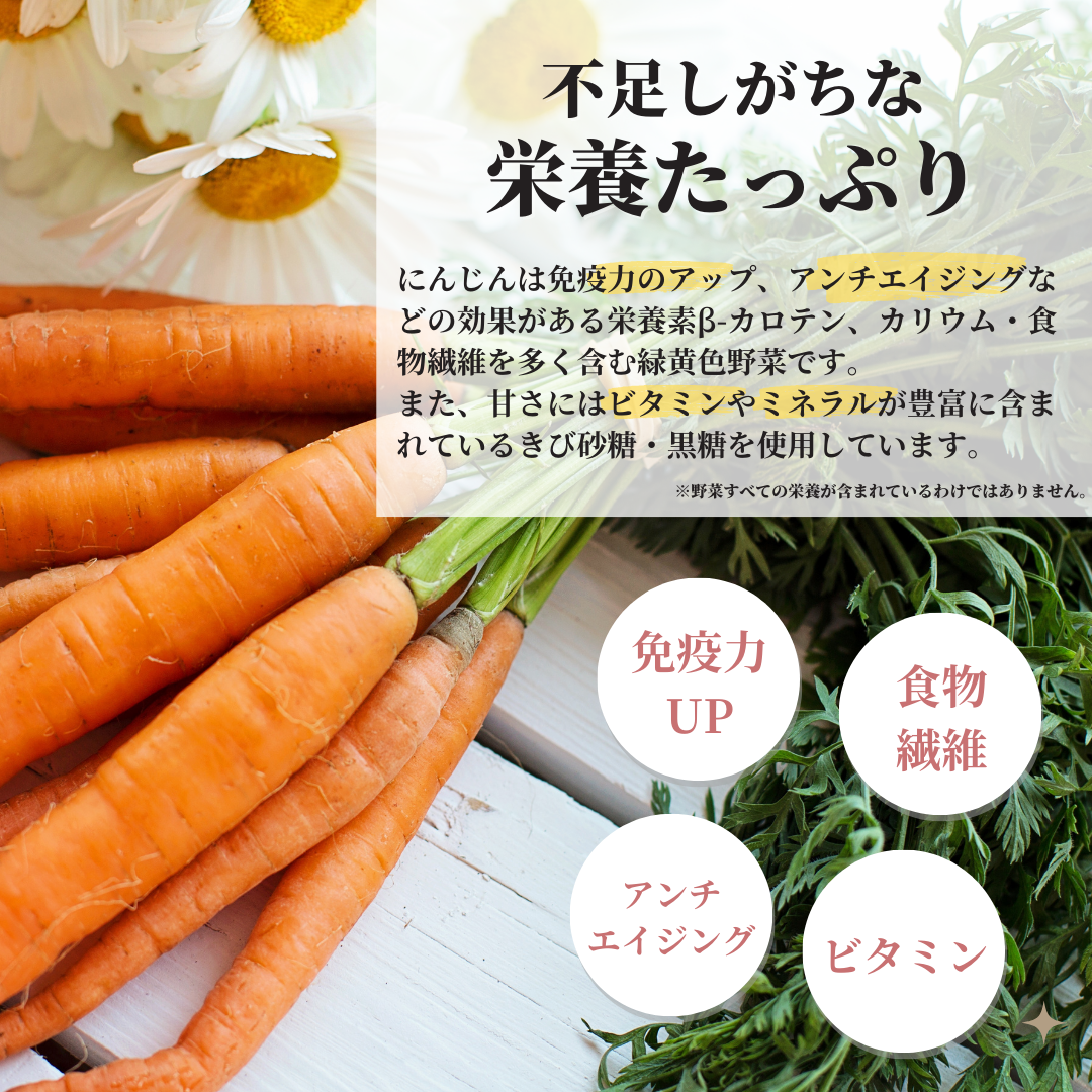 にんじんは免疫力のアップ、アンチエイジングなどの効果がある栄養素β-カロテン、カリウム・食物繊維を多く含む緑黄色野菜です。そんなにんじんの栄養価を「最も含む」形で製造しています。また、甘さにはビタミンやミネラルが豊富に含まれているきび砂糖・黒糖を使用しています。